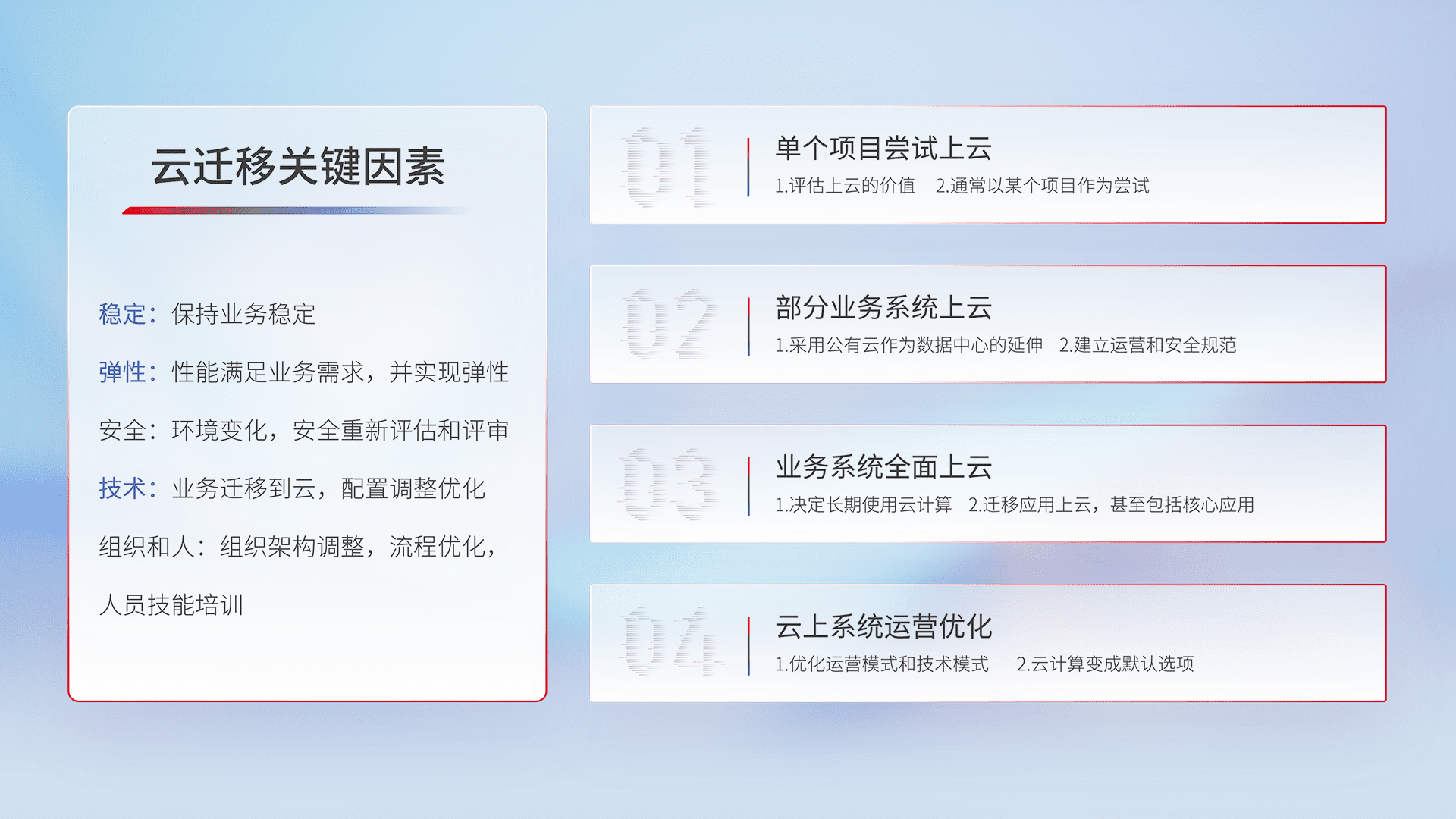 结合实际业务,,,,从规划设计、、云平台选型、、、、云原生改造、、、、数据迁移、、、、集成交付,,迁移全过程为客户识别最佳上云路径,,,,做好风险识别管理,,设计网络架构、、、、身份权限、、、、安全审计合规、、、操作审计、、日志审计、、、、监控告警策略、、、多站点容灾设计等,,对云上基础设施进行整体规划,,,,提升IT治理水平,,以满足弹性、、、、高可用、、、、高性能的需求。。。。